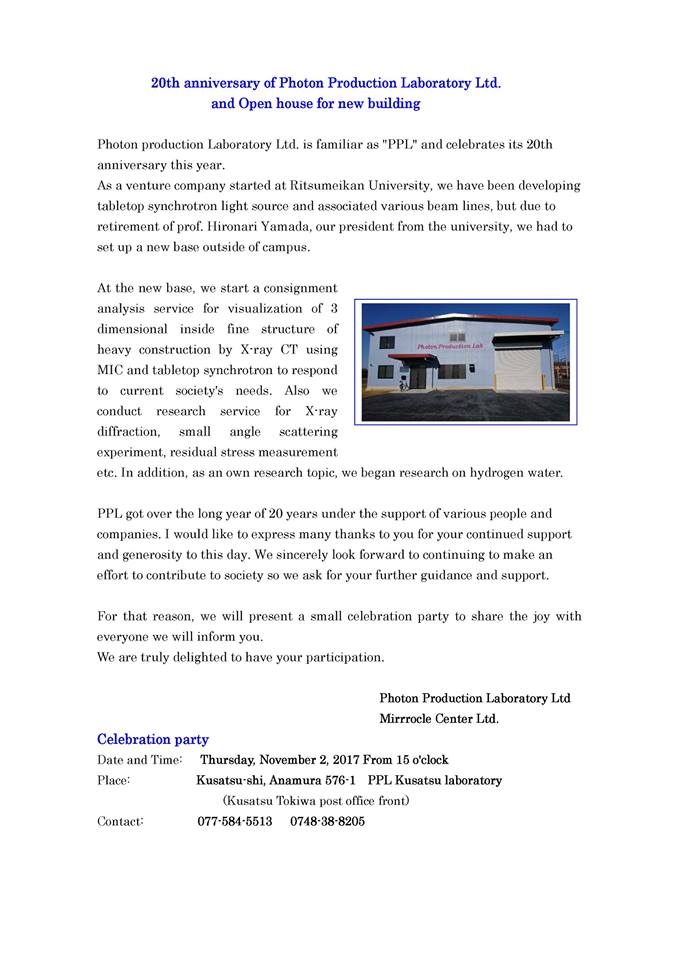 As inventor of the world's first tabletop storage ring synchrotron MIRRORCLE, founding PPL to grow and promote MIRRORCLE to the world has been the fulfillment of a lifetime goal. PPL is an exceptionally rare institute with its specialization in advanced electron accelerators. With the conventional electron accelerator manufacturing industry in decline, PPL has grown, with the goal to lead the electron accelerator industry. Once again we appreciate your continued support. PPL also has many peripheral activities that also support the development of MIRRORCLE. Starting originally as a core member supporting Ritsumeikan University Next 21st Century COE initiative and the Synchrotron Light Life Science Center. PPL continues to develop MIRRORCLE specific beam lines such as XRD, XAFS, SAXS, FTIR etc.